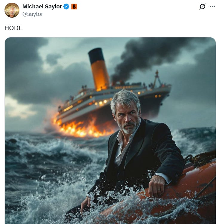 Of course, in Apple’s case, this faith manifests in material value. People buy a physical product. But cryptocurrency has moved further along the Sola Fide axis. Bitcoin bulls talk about scarcity but its real value lies in faith. MicroStrategy’s Michael Saylor posts that he is buying Bitcoin every day this week, even as its dollar-value plummets. One AI-generated image shows him on a life raft with the popular phrase HODL (Hold On for Dear Life). Don’t panic, don’t be influenced by worldly forces, because you are part of something greater that defies rational analysis.